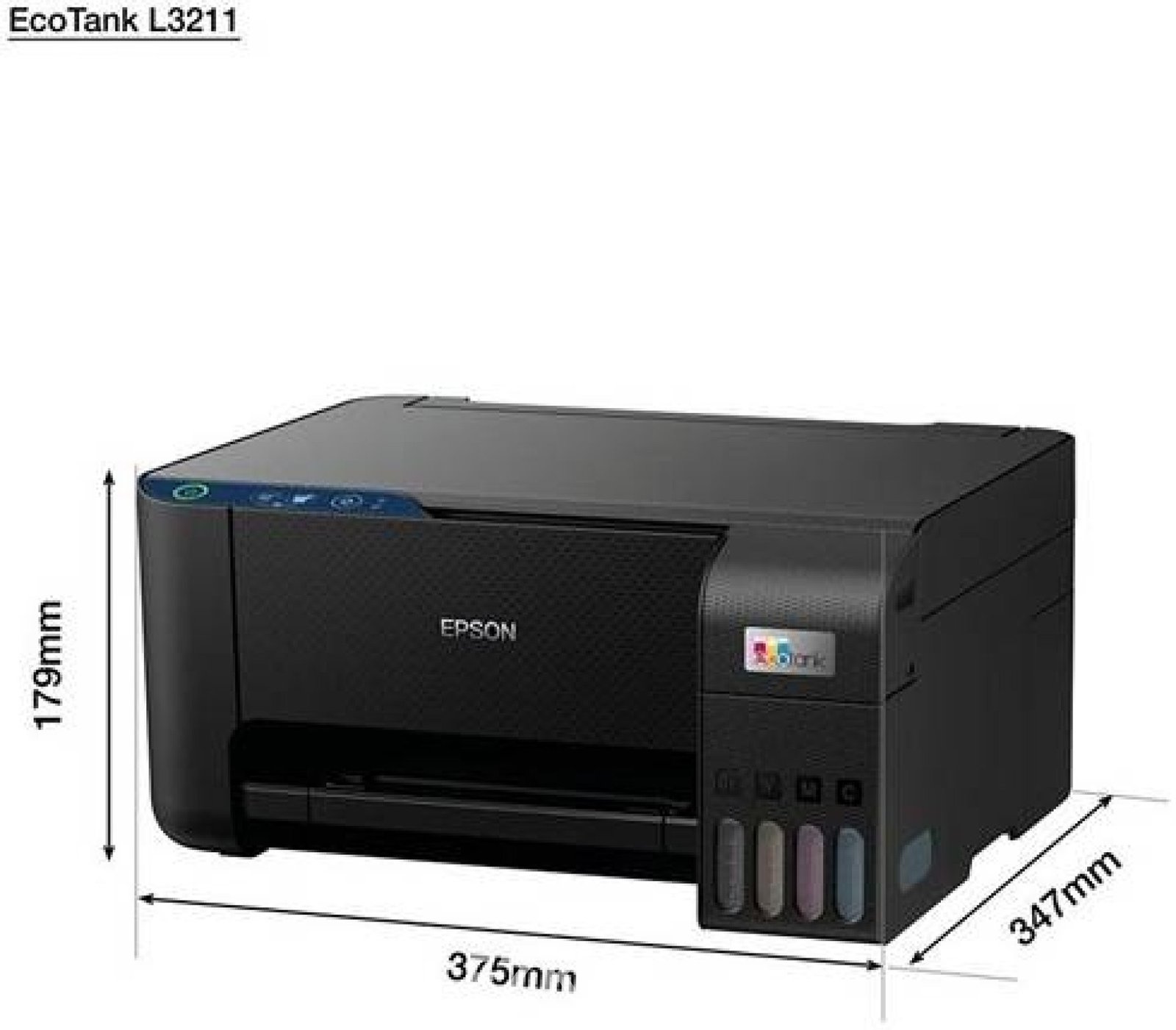 وصف ل إبسون EcoTank L3211 A4 اللون طابعة 3 في 1، 10 جزء في المليون سرعة الطباعة، ما يصل إلى 10x15cm طباعة الصور بلا حدود، 600x1200 DPI دقة المسح الضوئي، 100 ورقة ماكس / 20 ورقة صور ورقة صينية،